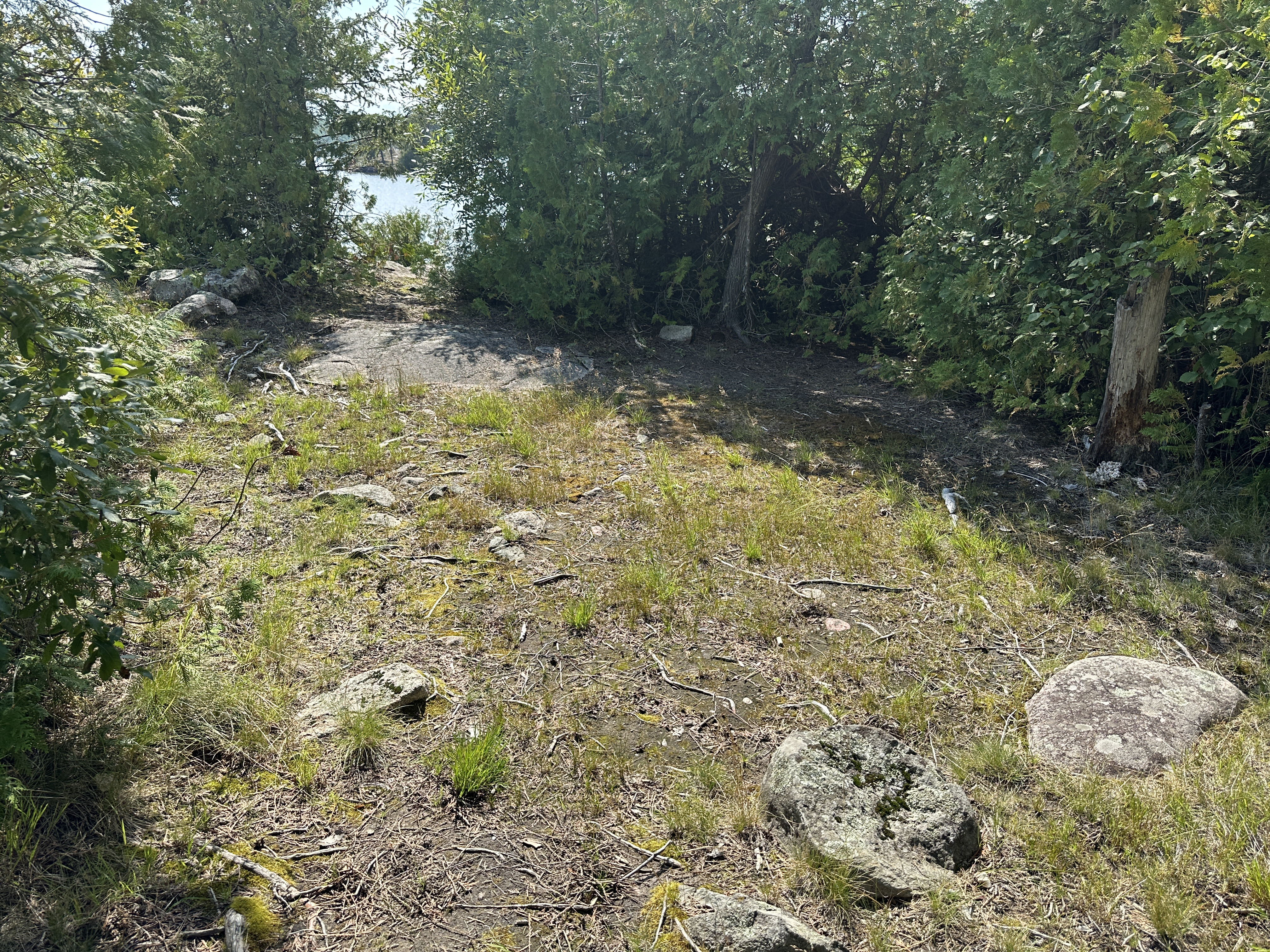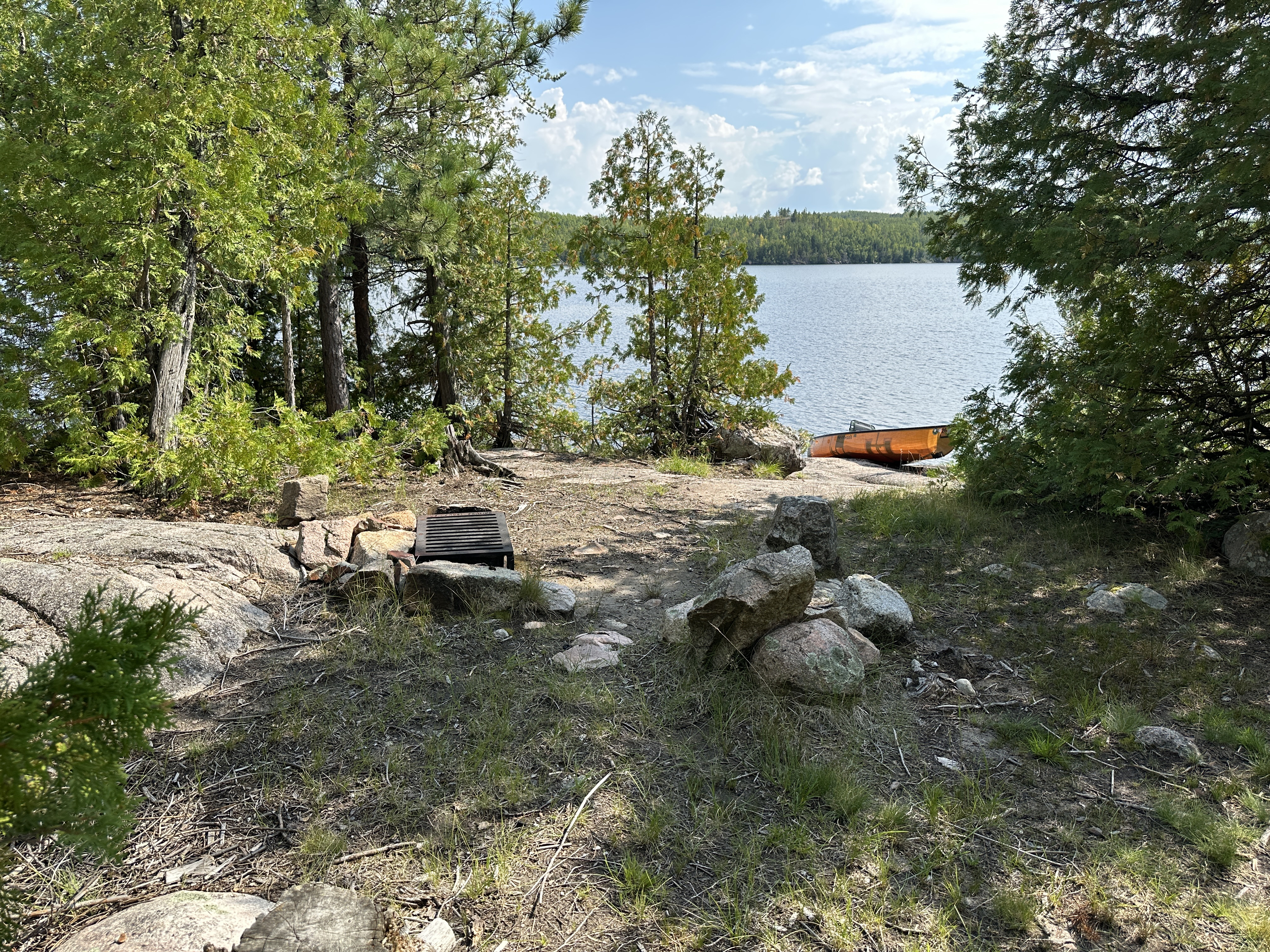 The campsite has a good canoe landing on a flat rock. Adequate shoreline access. There seems to be only one less than magnificent tent pad (lots of roots and rocks embedded in it). The seating area around the fire grate is well positioned. The kitchen itself is a bit of a wreck at time of last visit, but all the big boulders could be rearranged into a decent setup. Campsite will only support a small group or solo paddlers.
