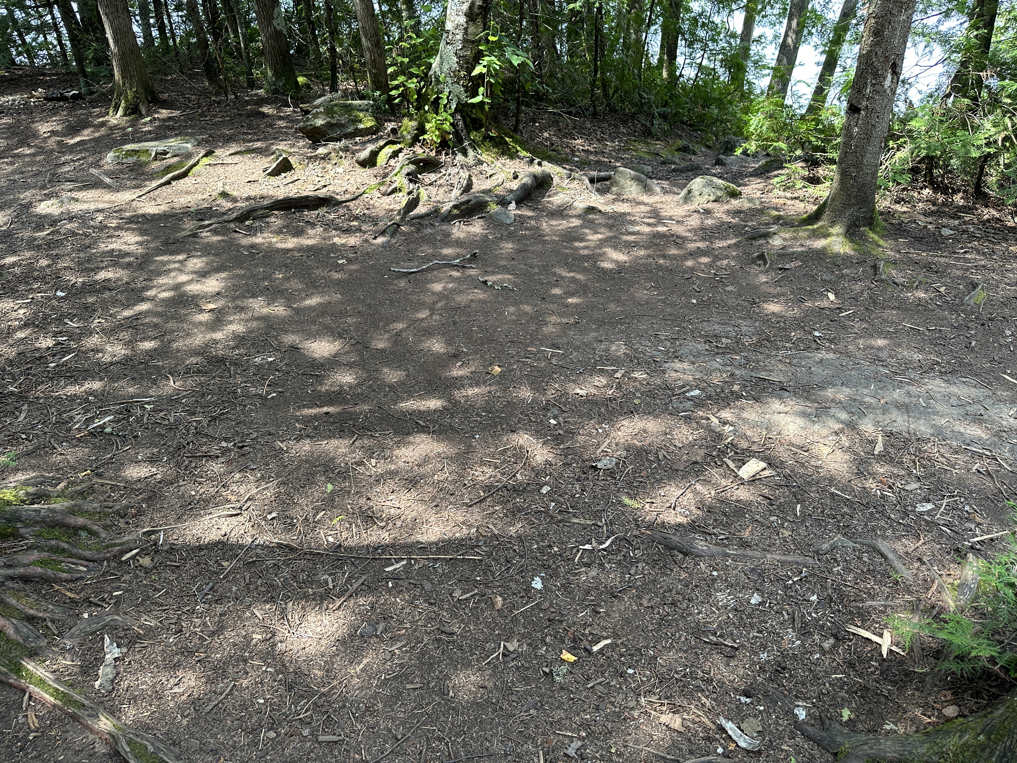 A good site. The fire pit and tent pads are back in the forest with no real views of the lake. There is a very handy rocky point that juts out into the lake right in front of the campsite. You can use this flat slab of rock to land canoes, fish, sit around or for a star viewing platform at night. It is a large campsite with plenty of room for all the tents you might have. The campsite is located a little to the north of the main route across Smoke Lake that runs between the Sawbill Lake and the Burnt Lake portages, so paddlers coming and going won't be passing by that closely (August 4, 2025).