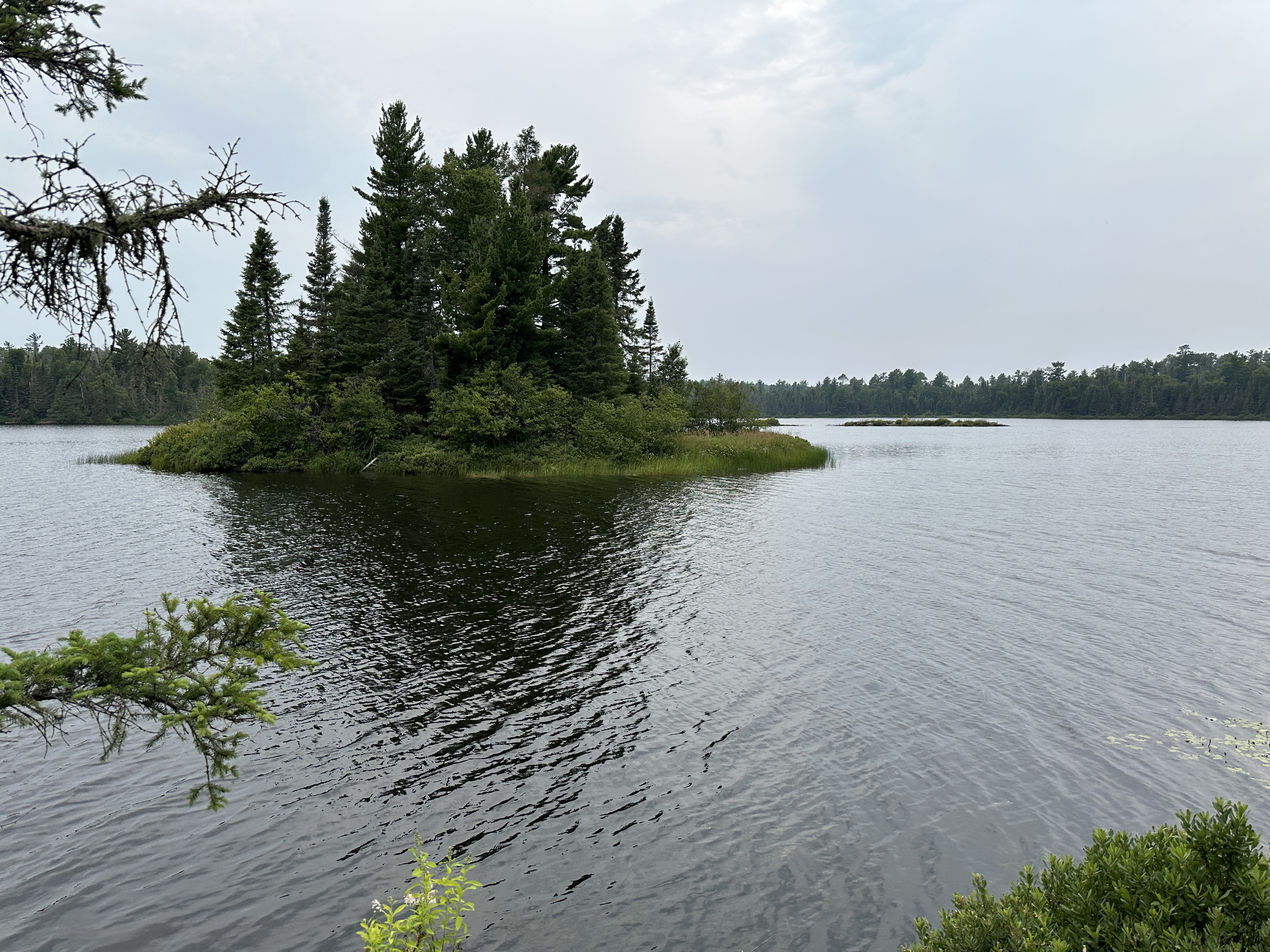 Canoe landing is on a large slanted rock slab. The fire grate at the time of this visit was partially covered by blowdown, but the kitchen area appeared to have a nice setup and location. There are three or four tent pads at this campsite. The two best pads are on the west side of the peninsula and are reached via a short trail through the woods. It's a fairly long hike to the latrine trail.
