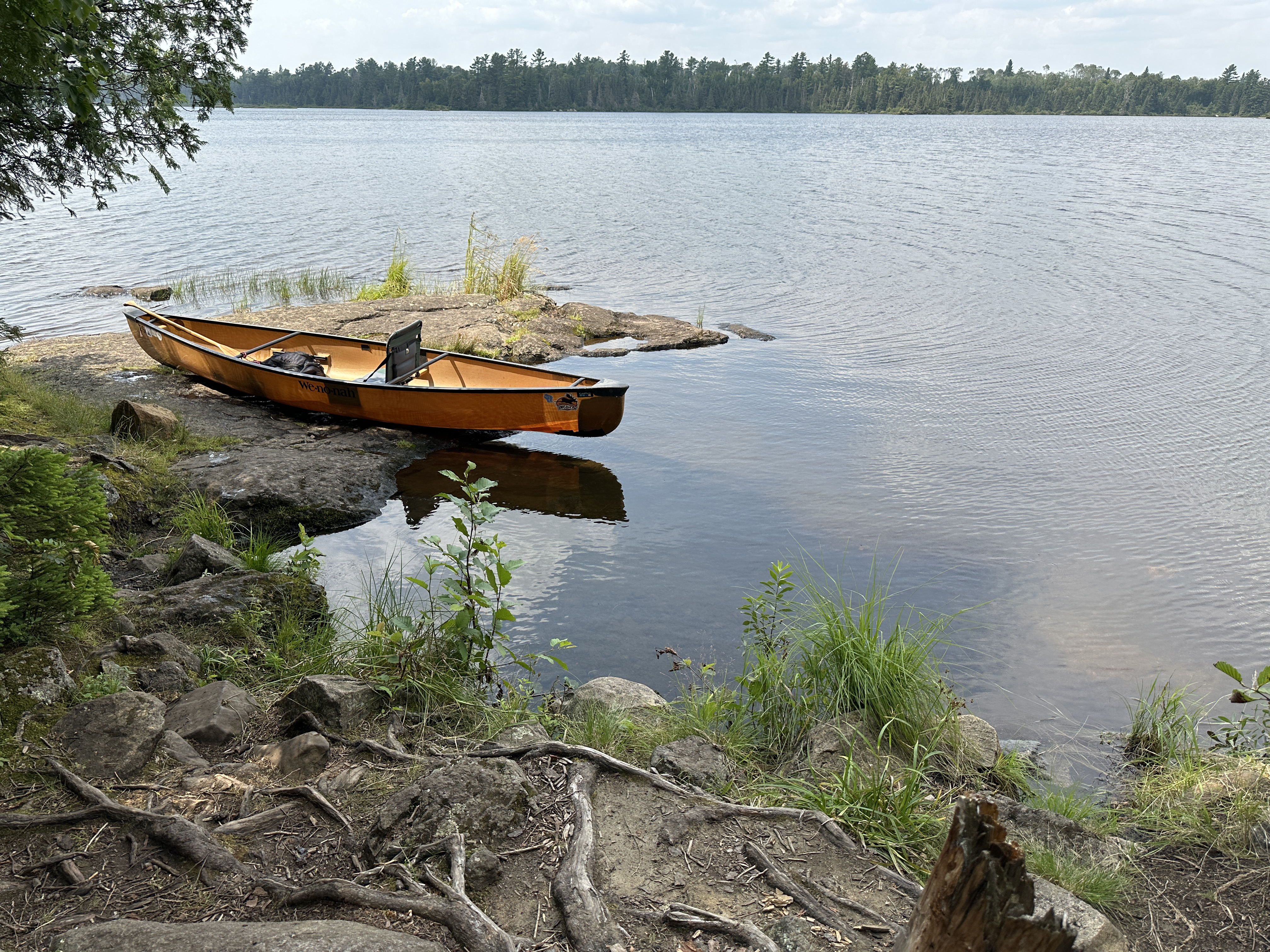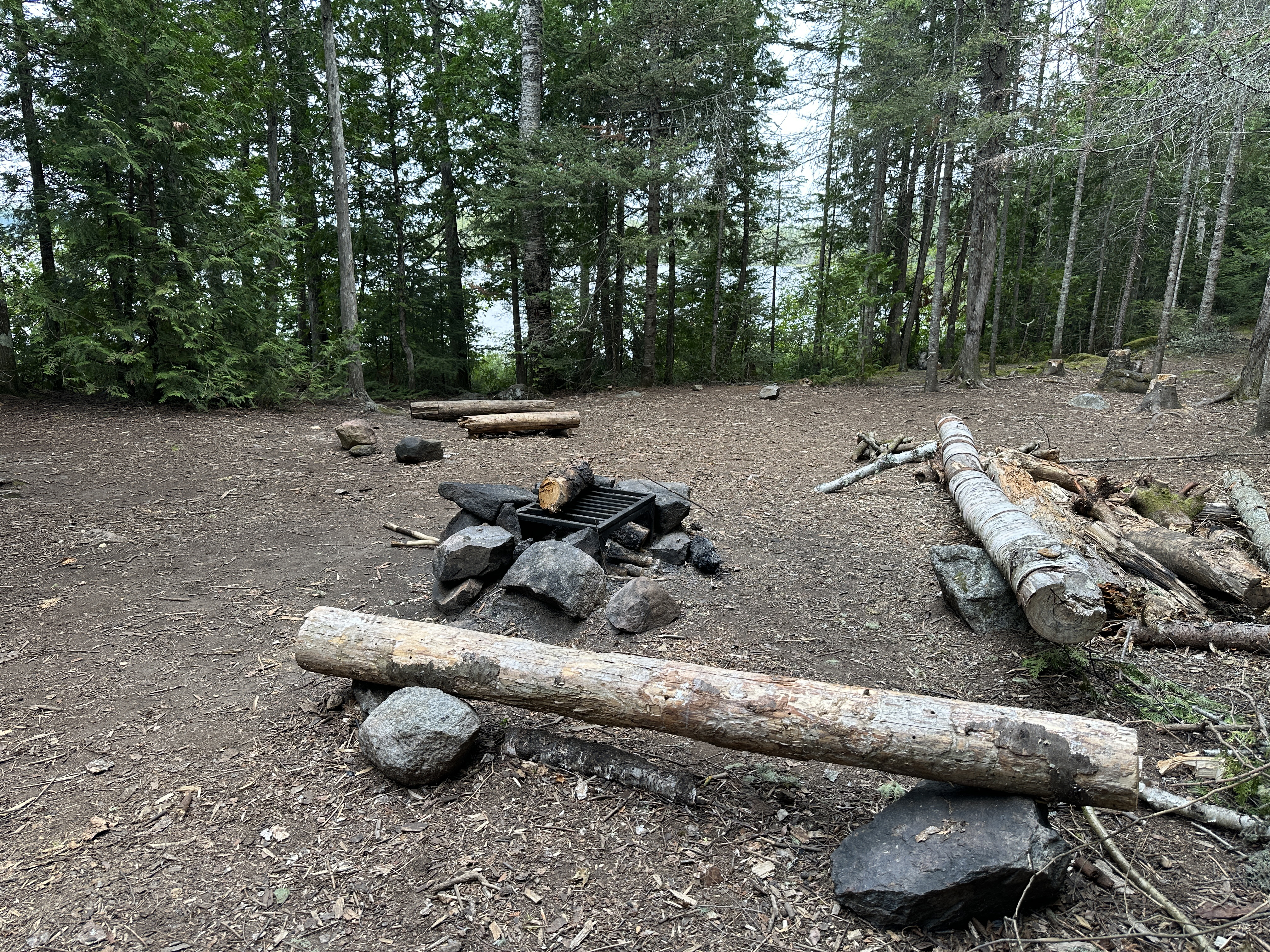 A good site. The fire pit and tent pads are back in the forest with no real views of the lake. There is a very handy rocky point that juts out into the lake right in front of the campsite. You can use this flat slab of rock to land canoes, fish, sit around or for a star viewing platform at night. It is a large campsite with plenty of room for all the tents you might have. The campsite is located a little to the north of the main route across Smoke Lake that runs between the Sawbill Lake and the Burnt Lake portages, so paddlers coming and going won't be passing by that closely (August 4, 2025).